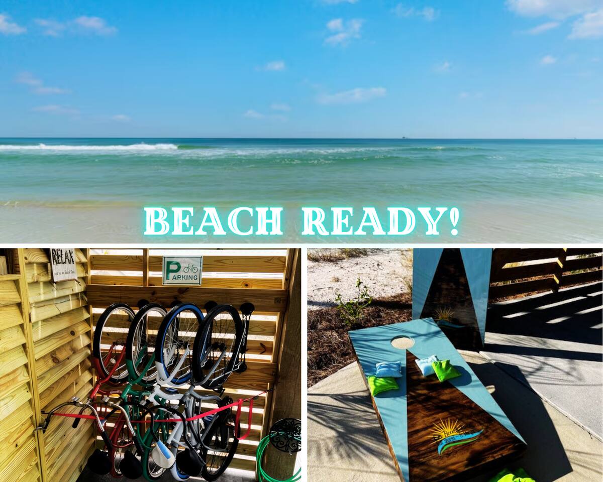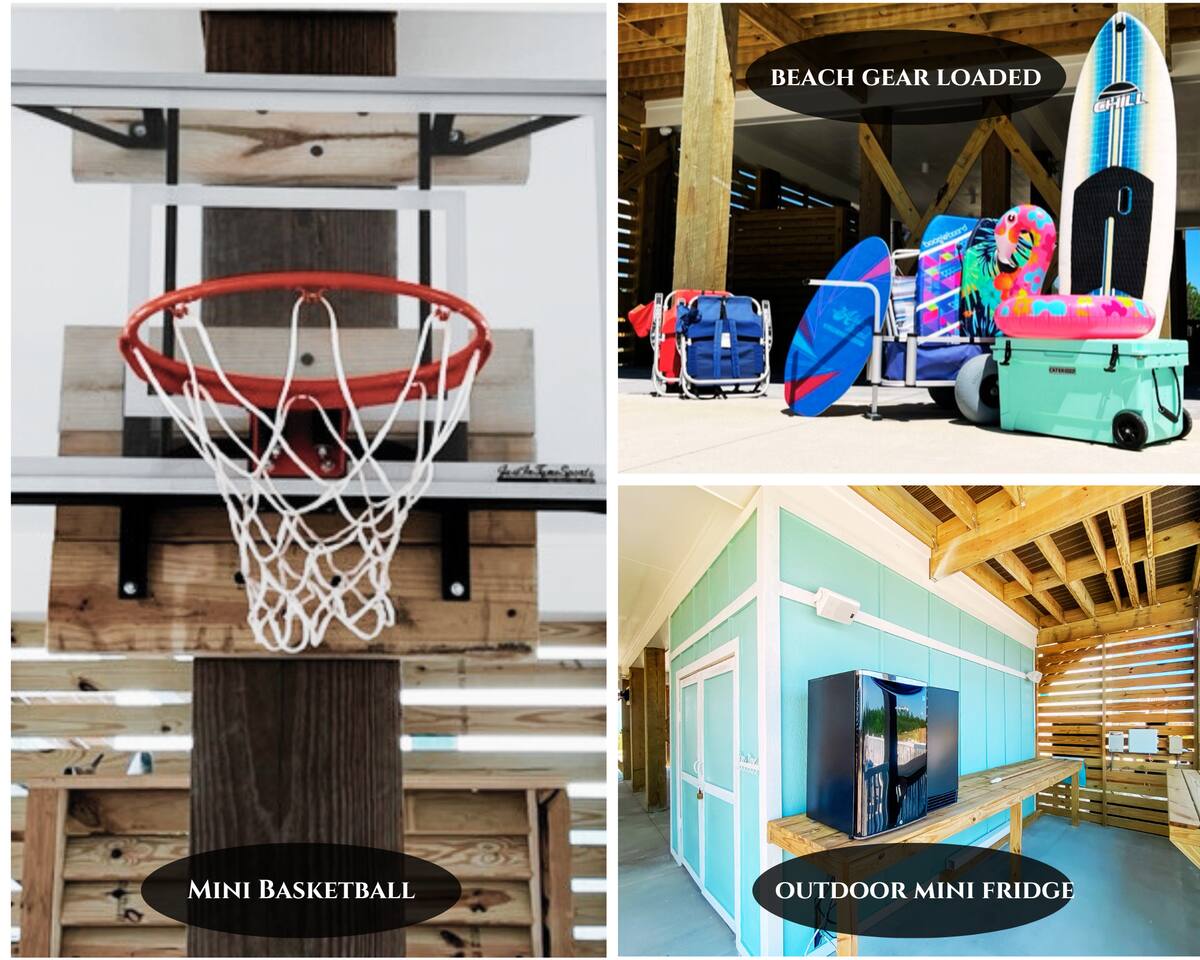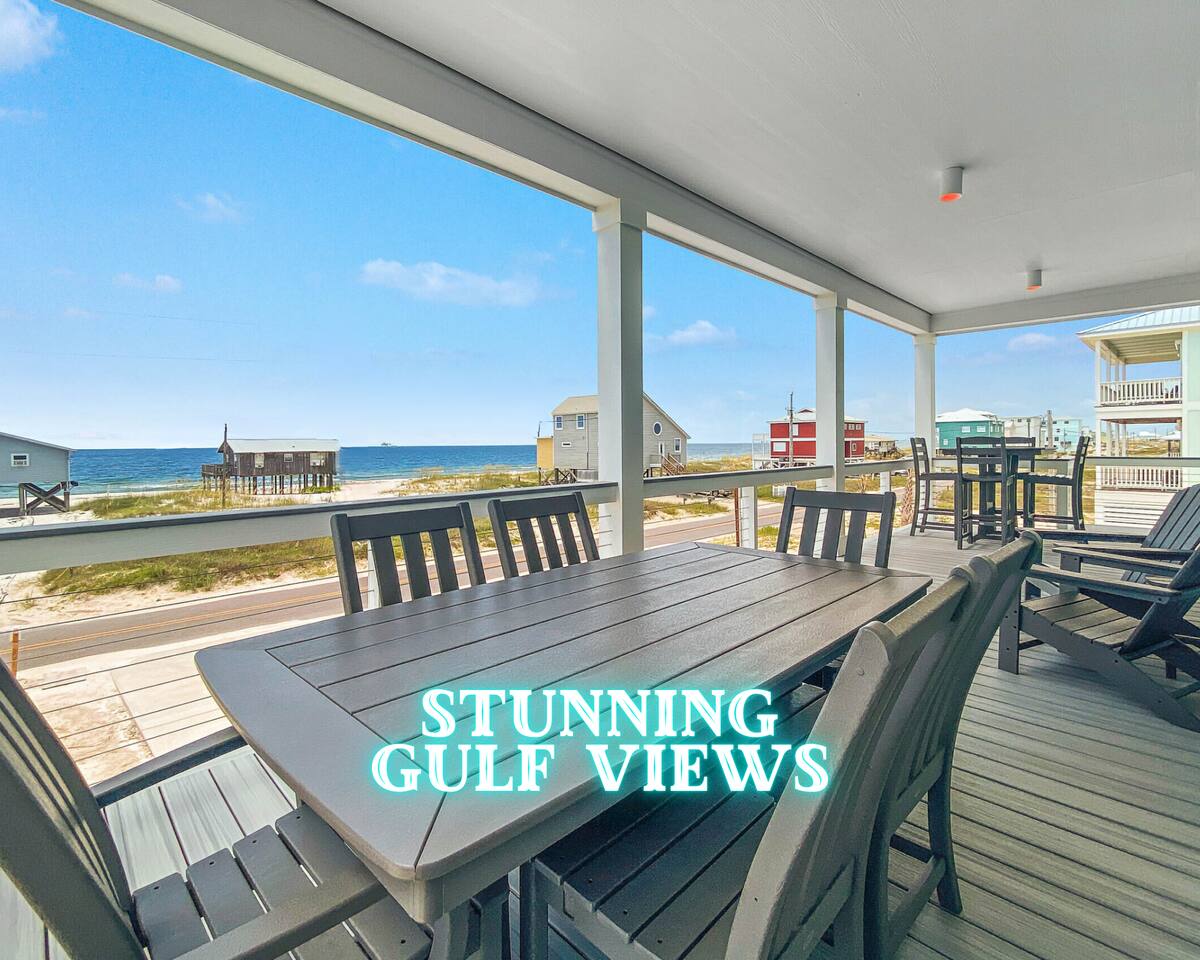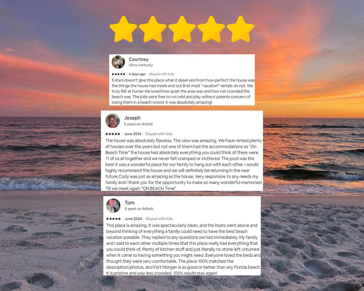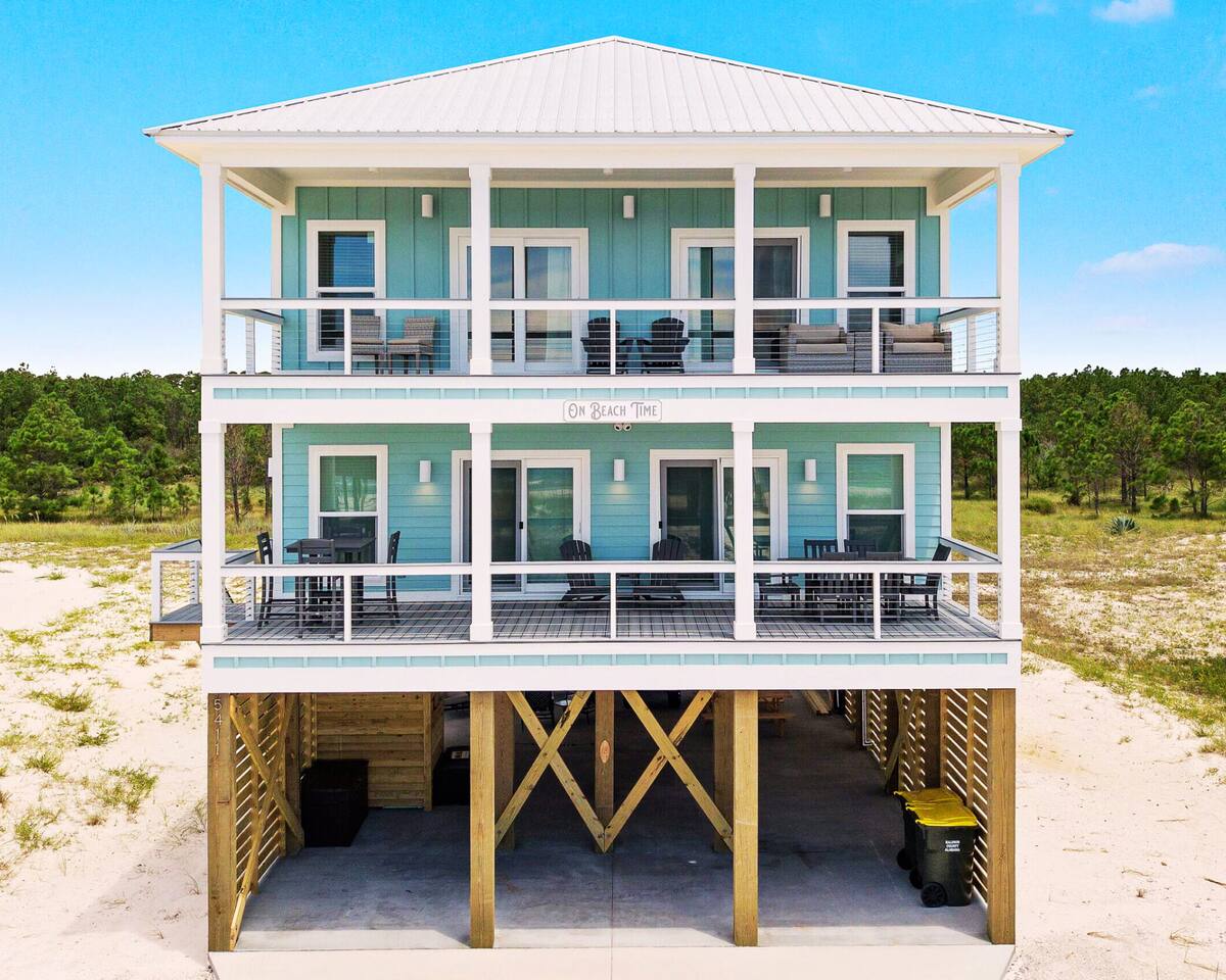 Welcome to "On Beach Time!" Experience the pinnacle of luxury at our exquisite Gulf Shores beach home. Newly furnished with stunning décor, this exclusive retreat boasts a private heated pool and is mere steps away from the pristine white sand beaches of the Emerald Coast. Indulge in breathtaking Gulf views over a cup of morning coffee on the spacious balcony...then spend your afternoons enjoying a range of amenities including cornhole, paddle boards, kayaks, and more. Elevate your beach vacation with unparalleled comfort and style at our Gulf Shores oasis...we would love for you to be our guest! ☆☆ KEY FEATURES ☆☆ ☀ Sleeps 12; 4 BR/3.5 BA, 2 king beds, 1 queen bed and 2 sets of twin over full bunks ☀ Smart TVs in each bedroom ☀ 2 Living Rooms: Each equipped with large Smart TVs and ample seating ☀ Modern and well-equipped kitchen with ample seating ☀ 3 private balconies with ample seating, 2 with Gulf views and the other overlooking the private pool ☀ Christmas Tree provided for holiday stays! ☀ Above and beyond luxury amenities listed below ☆☆ 1ST FLOOR ☆☆ *1ST FLOOR DECK* Panoramic ocean view Bar height table with 4 chairs 2 Adirondack chairs with side table Dining table with six chairs *KITCHEN* Fully stocked kitchen Lots of extra cabinet space for food and beverage storage Quartz countertops Stainless steel appliances Cooktop stove Dishwasher Microwave Dishes and Utensils Ninja DualBrew Coffee Maker Keurig K- Slim single serve K-Cup coffee maker Mr Coffee 12 cup coffee maker Primula Burke Deluxe Cold Brew Iced Coffee Maker Ninja blender/food processor Popcorn maker Crock pots Phone charging station *DINING ROOM* Large Dining room table seats up to 8 4 additional seats at island bar *LIVING ROOM* 2 sofas 2 Comfy, Plush swivel chairs 55in Roku TV Gulf Front view with Patio door leading to expansive deck *1ST FLOOR MASTER SUITE* King Size Luxury Mattress 42in Roku TV Gulf Front view with Patio door leading to expansive deck Master Bath Walk in shower Dual Shower Head with Adjustable Handheld shower head Dual sink vanity Master Closet Walk in closet with organizer *HALL HALF BATH* Toilet with single vanity *LAUNDRY ROOM* Washer Dryer Iron/ Ironing Board Vacuum Drying rack Beach towels ☆☆ 2ND FLOOR ☆☆ *2ND FLOOR DECK* Panoramic ocean view Two Adirondack chairs with side table 2 large cushioned wicker patio chairs with cup holders 2 additional patio wicker chairs *2ND FLOOR MASTER SUITE* King size luxury mattress 42in Roku TV Spacious closet with organizer Gulf Front view with Patio door leading to expansive deck Master Bath Walk in shower Dual Shower Head with Adjustable Handheld shower head Dual sink vanity *2ND FLOOR FAMILY ROOM* Large sectional sofa Sofa Comfy plush swivel chair 70in Roku TV Sound bar with surround sound PlayStation 4 gaming system with games Family board games Gulf Front view with Patio door leading to expansive deck *2ND FLOOR BATHROOM* Tub/Shower combo Dual sink vanity *2ND FLOOR QUEEN BEDROOM* Queen size luxury mattress 1 comfy, Plush swivel chair 42in Roku TV Large Spacious closet with clothes and shoe organizer Makeup vanity set with chair *BUNK ROOM* Custom made bunk beds 2 Twin beds over 2 Full Beds with luxury mattresses Spacious closet with organizer 42in Roku TV *POOL VIEW BACK DECK* 2 patio wicker chairs and table Shoe organizer ☆☆ OUTDOOR AREA & AMENITIES ☆☆ Heated Pool Bar with mini refrigerator & icemaker Pool lounge chairs Outdoor shower with hot/cold water 2 picnic tables Charcoal grill Patio furniture Mini Basketball goal Tiki ring toss Game Large Jenga Corn Hole Beach cart Chairs Umbrellas Boogie Boards Beach Toys Bicycles Paddle board Kayak Beach chairs Beach tent Boogie boards Large beach wagon with balloon tires Large beach wheeled cooler ★★ Book Today & Let Us Take Care Of You In Gulf Shores! ★★