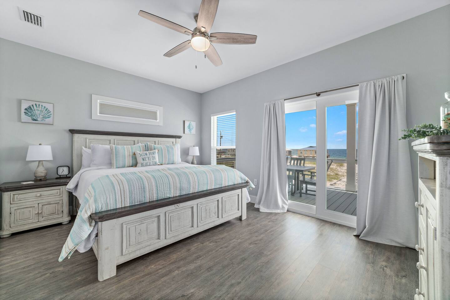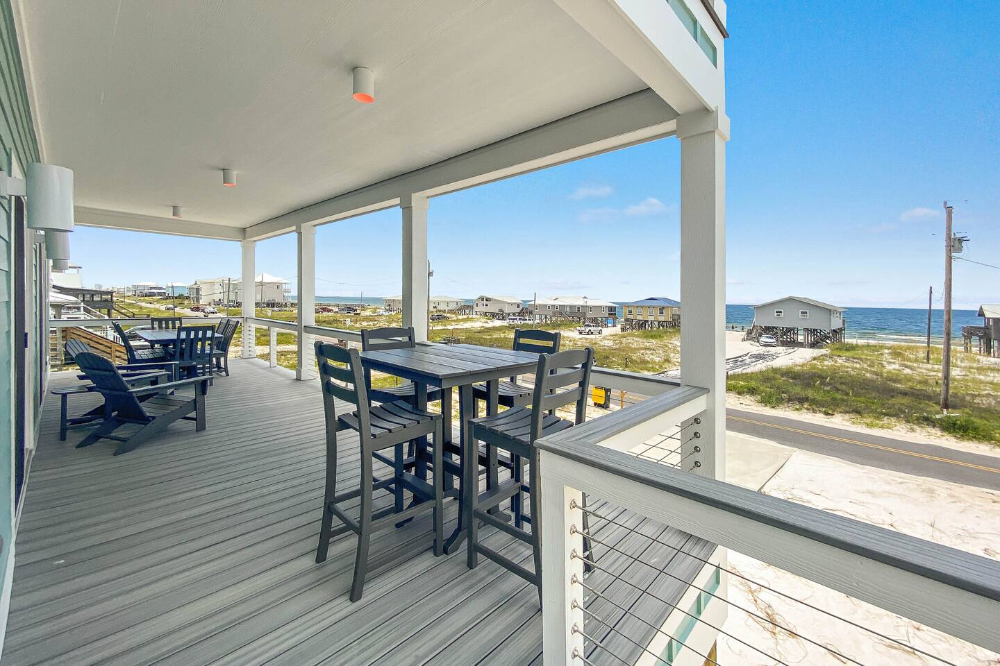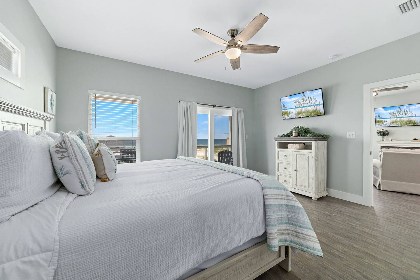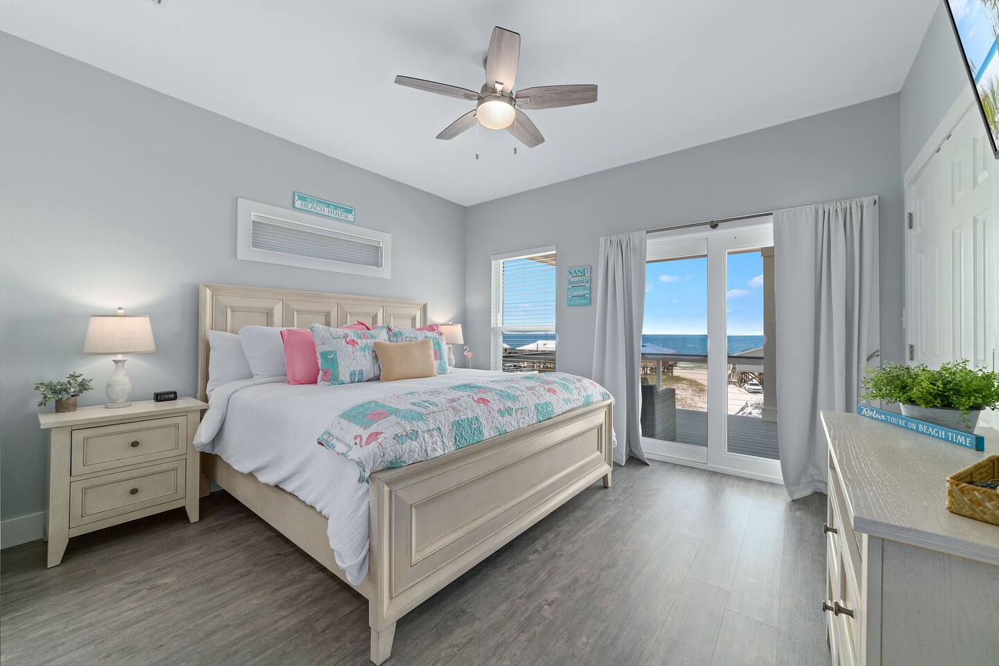 Welcome to "On Beach Time!" Experience the pinnacle of luxury at our exquisite Gulf Shores beach home. Newly furnished with stunning décor, this exclusive retreat boasts a private heated pool and is mere steps away from the pristine white sand beaches of the Emerald Coast. Indulge in breathtaking Gulf views over a cup of morning coffee on the spacious balcony...then spend your afternoons enjoying a range of amenities including cornhole, paddle boards, kayaks, and more. Elevate your beach vacation with unparalleled comfort and style at our Gulf Shores oasis...we would love for you to be our guest! ☆☆ KEY FEATURES ☆☆ ☀ Sleeps 12; 4 BR/3.5 BA, 2 king beds, 1 queen bed and 2 sets of twin over full bunks ☀ Smart TVs in each bedroom ☀ 2 Living Rooms: Each equipped with large Smart TVs and ample seating ☀ Modern and well-equipped kitchen with ample seating ☀ 3 private balconies with ample seating, 2 with Gulf views and the other overlooking the private pool ☀ Christmas Tree provided for holiday stays! ☀ Above and beyond luxury amenities listed below ☆☆ 1ST FLOOR ☆☆ *1ST FLOOR DECK* Panoramic ocean view Bar height table with 4 chairs 2 Adirondack chairs with side table Dining table with six chairs *KITCHEN* Fully stocked kitchen Lots of extra cabinet space for food and beverage storage Quartz countertops Stainless steel appliances Cooktop stove Dishwasher Microwave Dishes and Utensils Ninja DualBrew Coffee Maker Keurig K- Slim single serve K-Cup coffee maker Mr Coffee 12 cup coffee maker Primula Burke Deluxe Cold Brew Iced Coffee Maker Ninja blender/food processor Popcorn maker Crock pots Phone charging station *DINING ROOM* Large Dining room table seats up to 8 4 additional seats at island bar *LIVING ROOM* 2 sofas 2 Comfy, Plush swivel chairs 55in Roku TV Gulf Front view with Patio door leading to expansive deck *1ST FLOOR MASTER SUITE* King Size Luxury Mattress 42in Roku TV Gulf Front view with Patio door leading to expansive deck Master Bath Walk in shower Dual Shower Head with Adjustable Handheld shower head Dual sink vanity Master Closet Walk in closet with organizer *HALL HALF BATH* Toilet with single vanity *LAUNDRY ROOM* Washer Dryer Iron/ Ironing Board Vacuum Drying rack Beach towels ☆☆ 2ND FLOOR ☆☆ *2ND FLOOR DECK* Panoramic ocean view Two Adirondack chairs with side table 2 large cushioned wicker patio chairs with cup holders 2 additional patio wicker chairs *2ND FLOOR MASTER SUITE* King size luxury mattress 42in Roku TV Spacious closet with organizer Gulf Front view with Patio door leading to expansive deck Master Bath Walk in shower Dual Shower Head with Adjustable Handheld shower head Dual sink vanity *2ND FLOOR FAMILY ROOM* Large sectional sofa Sofa Comfy plush swivel chair 70in Roku TV Sound bar with surround sound PlayStation 4 gaming system with games Family board games Gulf Front view with Patio door leading to expansive deck *2ND FLOOR BATHROOM* Tub/Shower combo Dual sink vanity *2ND FLOOR QUEEN BEDROOM* Queen size luxury mattress 1 comfy, Plush swivel chair 42in Roku TV Large Spacious closet with clothes and shoe organizer Makeup vanity set with chair *BUNK ROOM* Custom made bunk beds 2 Twin beds over 2 Full Beds with luxury mattresses Spacious closet with organizer 42in Roku TV *POOL VIEW BACK DECK* 2 patio wicker chairs and table Shoe organizer ☆☆ OUTDOOR AREA & AMENITIES ☆☆ Heated Pool Bar with mini refrigerator & icemaker Pool lounge chairs Outdoor shower with hot/cold water 2 picnic tables Charcoal grill Patio furniture Mini Basketball goal Tiki ring toss Game Large Jenga Corn Hole Beach cart Chairs Umbrellas Boogie Boards Beach Toys Bicycles Paddle board Kayak Beach chairs Beach tent Boogie boards Large beach wagon with balloon tires Large beach wheeled cooler ★★ Book Today & Let Us Take Care Of You In Gulf Shores! ★★