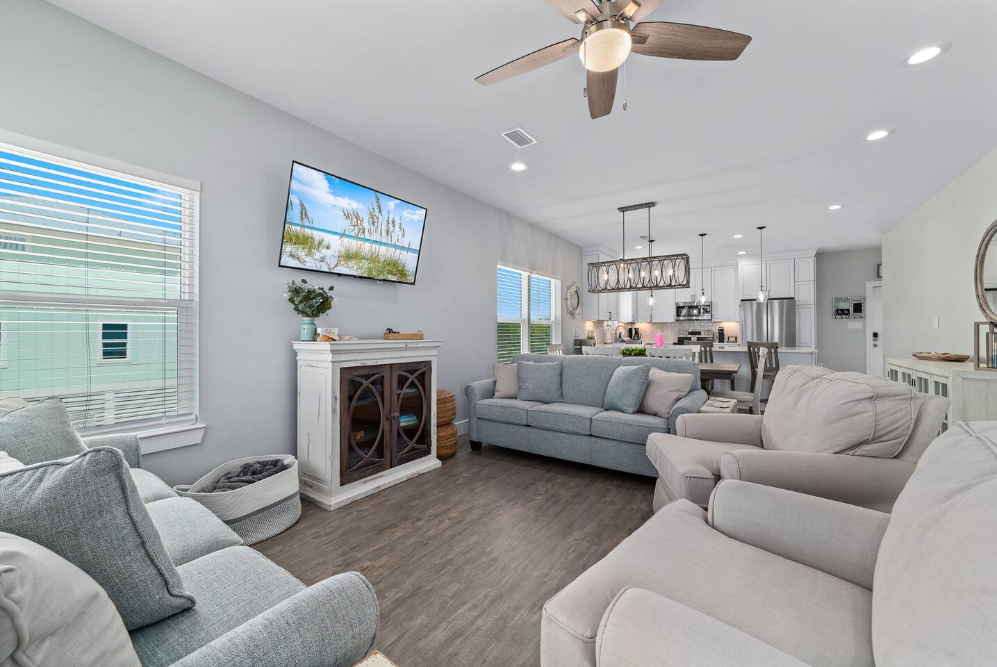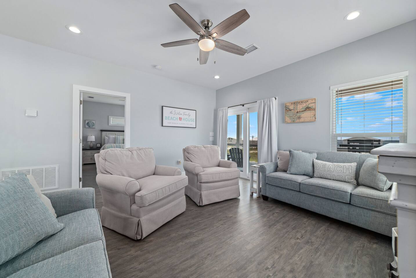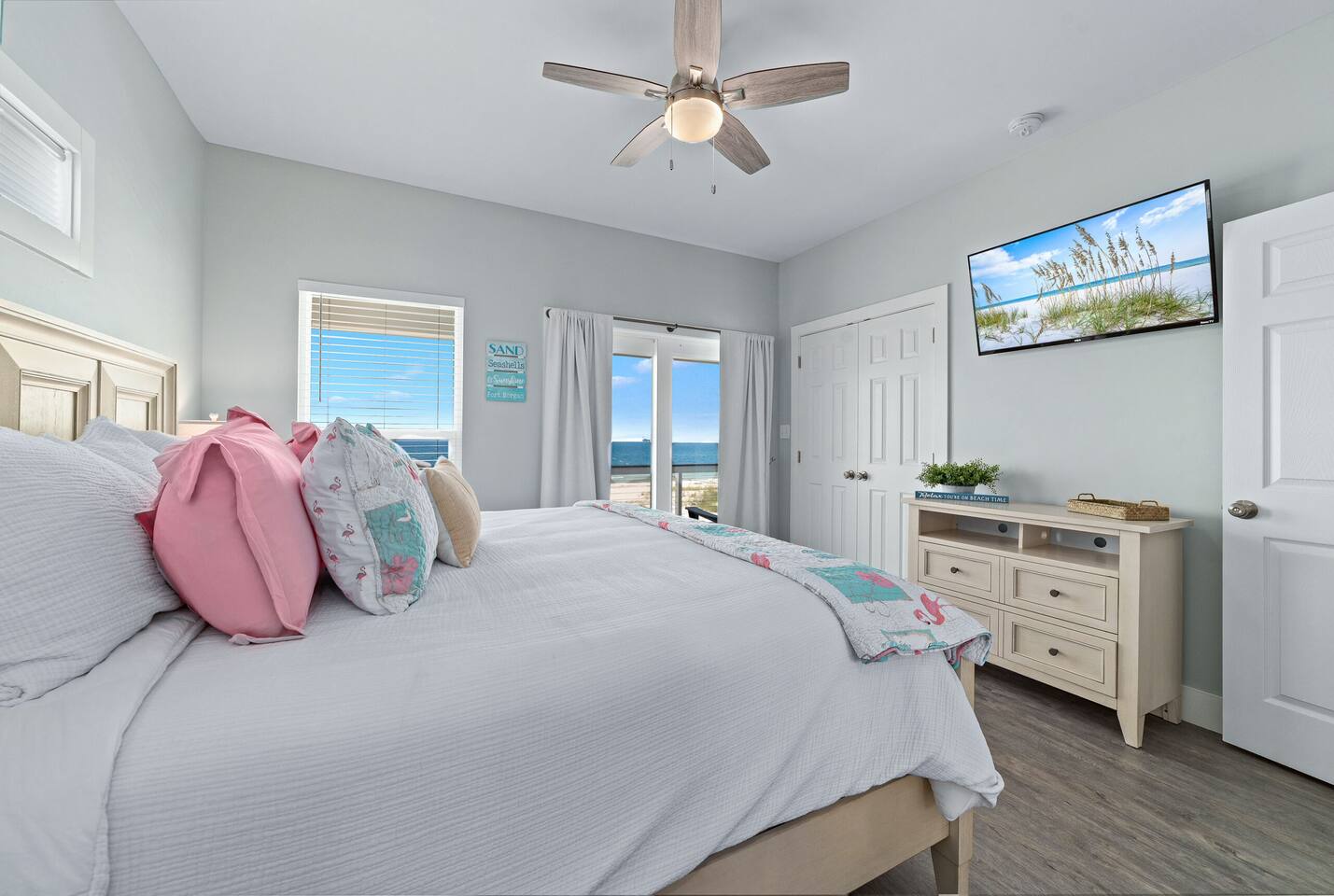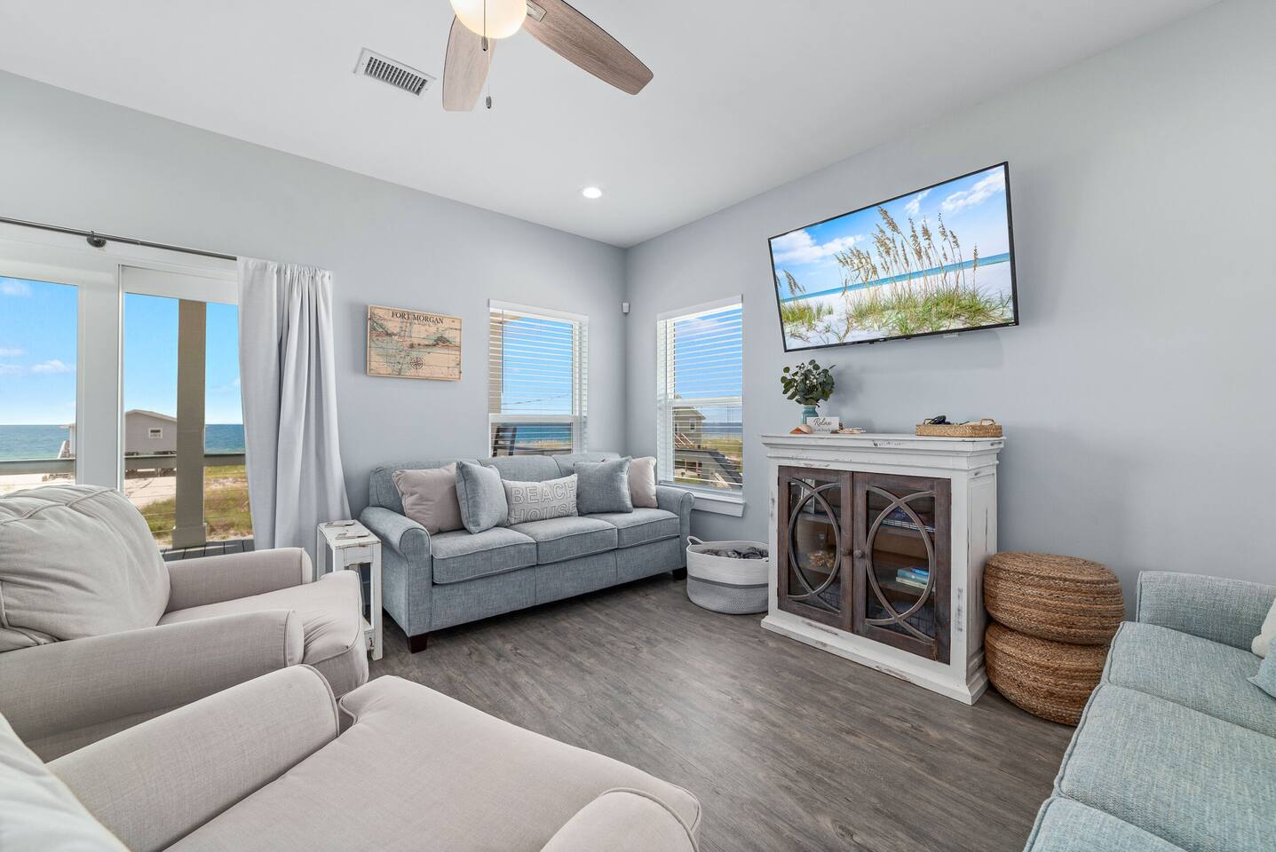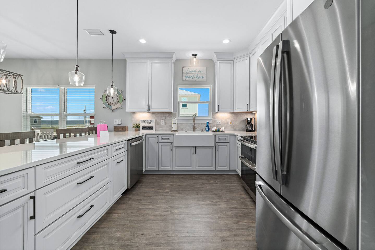 Welcome to "On Beach Time!" Experience the pinnacle of luxury at our exquisite Gulf Shores beach home. Newly furnished with stunning décor, this exclusive retreat boasts a private heated pool and is mere steps away from the pristine white sand beaches of the Emerald Coast. Indulge in breathtaking Gulf views over a cup of morning coffee on the spacious balcony...then spend your afternoons enjoying a range of amenities including cornhole, paddle boards, kayaks, and more. Elevate your beach vacation with unparalleled comfort and style at our Gulf Shores oasis...we would love for you to be our guest! ☆☆ KEY FEATURES ☆☆ ☀ Sleeps 12; 4 BR/3.5 BA, 2 king beds, 1 queen bed and 2 sets of twin over full bunks ☀ Smart TVs in each bedroom ☀ 2 Living Rooms: Each equipped with large Smart TVs and ample seating ☀ Modern and well-equipped kitchen with ample seating ☀ 3 private balconies with ample seating, 2 with Gulf views and the other overlooking the private pool ☀ Christmas Tree provided for holiday stays! ☀ Above and beyond luxury amenities listed below ☆☆ 1ST FLOOR ☆☆ *1ST FLOOR DECK* Panoramic ocean view Bar height table with 4 chairs 2 Adirondack chairs with side table Dining table with six chairs *KITCHEN* Fully stocked kitchen Lots of extra cabinet space for food and beverage storage Quartz countertops Stainless steel appliances Cooktop stove Dishwasher Microwave Dishes and Utensils Ninja DualBrew Coffee Maker Keurig K- Slim single serve K-Cup coffee maker Mr Coffee 12 cup coffee maker Primula Burke Deluxe Cold Brew Iced Coffee Maker Ninja blender/food processor Popcorn maker Crock pots Phone charging station *DINING ROOM* Large Dining room table seats up to 8 4 additional seats at island bar *LIVING ROOM* 2 sofas 2 Comfy, Plush swivel chairs 55in Roku TV Gulf Front view with Patio door leading to expansive deck *1ST FLOOR MASTER SUITE* King Size Luxury Mattress 42in Roku TV Gulf Front view with Patio door leading to expansive deck Master Bath Walk in shower Dual Shower Head with Adjustable Handheld shower head Dual sink vanity Master Closet Walk in closet with organizer *HALL HALF BATH* Toilet with single vanity *LAUNDRY ROOM* Washer Dryer Iron/ Ironing Board Vacuum Drying rack Beach towels ☆☆ 2ND FLOOR ☆☆ *2ND FLOOR DECK* Panoramic ocean view Two Adirondack chairs with side table 2 large cushioned wicker patio chairs with cup holders 2 additional patio wicker chairs *2ND FLOOR MASTER SUITE* King size luxury mattress 42in Roku TV Spacious closet with organizer Gulf Front view with Patio door leading to expansive deck Master Bath Walk in shower Dual Shower Head with Adjustable Handheld shower head Dual sink vanity *2ND FLOOR FAMILY ROOM* Large sectional sofa Sofa Comfy plush swivel chair 70in Roku TV Sound bar with surround sound PlayStation 4 gaming system with games Family board games Gulf Front view with Patio door leading to expansive deck *2ND FLOOR BATHROOM* Tub/Shower combo Dual sink vanity *2ND FLOOR QUEEN BEDROOM* Queen size luxury mattress 1 comfy, Plush swivel chair 42in Roku TV Large Spacious closet with clothes and shoe organizer Makeup vanity set with chair *BUNK ROOM* Custom made bunk beds 2 Twin beds over 2 Full Beds with luxury mattresses Spacious closet with organizer 42in Roku TV *POOL VIEW BACK DECK* 2 patio wicker chairs and table Shoe organizer ☆☆ OUTDOOR AREA & AMENITIES ☆☆ Heated Pool Bar with mini refrigerator & icemaker Pool lounge chairs Outdoor shower with hot/cold water 2 picnic tables Charcoal grill Patio furniture Mini Basketball goal Tiki ring toss Game Large Jenga Corn Hole Beach cart Chairs Umbrellas Boogie Boards Beach Toys Bicycles Paddle board Kayak Beach chairs Beach tent Boogie boards Large beach wagon with balloon tires Large beach wheeled cooler ★★ Book Today & Let Us Take Care Of You In Gulf Shores! ★★